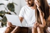 blurred and happy lesbian couple watching movie on laptop