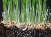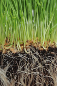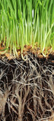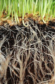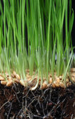 makro zbliżenie pszenicy trawy rosnące z korzeniami w ziemi brud i gleby