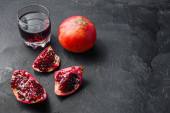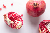 Huice granat w szkle z cięciami i cały granat na białym tle teksturowanym, widok z góry z miejsca na tekst
