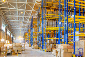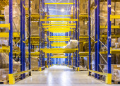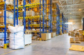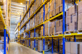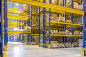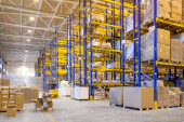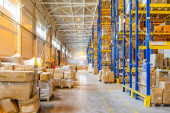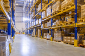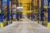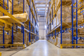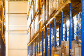 Wnętrze nowoczesnego magazynu z rzędami i skrzynkami towarowymi na wysokich półkach