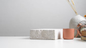 Zdjęcie "Minimalistyczna koncepcja wnętrza salonu w eleganckim apartamencie z drewnianą toaletą, liściem w ceramicznym wazonie i eleganckimi akcesoriami osobistymi w nowoczesnym wystroju wnętrz. Odbiór. Wzór. ." może być wykorzystywane do celów osobistych i komercyjnych zgodnie z warunkami zakupionej licencji Royalty-free. Obraz jest dostępny do pobrania w jakości wysokiej rozdzielczości do 5760x3840.