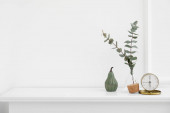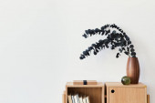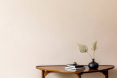 Minimalistyczna koncepcja wnętrza salonu w eleganckim apartamencie z drewnianą toaletą, liściem w ceramicznym wazonie i eleganckimi akcesoriami osobistymi w nowoczesnym wystroju wnętrz. Odbiór. Wzór. .