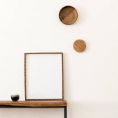 Zdjęcie "Minimalistyczna koncepcja wnętrza salonu w eleganckim apartamencie z drewnianą toaletą, liściem w ceramicznym wazonie i eleganckimi akcesoriami osobistymi w nowoczesnym wystroju wnętrz. Odbiór. Wzór. ." może być wykorzystywane do celów osobistych i komercyjnych zgodnie z warunkami zakupionej licencji Royalty-free. Obraz jest dostępny do pobrania w jakości wysokiej rozdzielczości do 5760x3840.