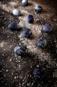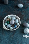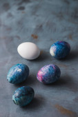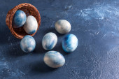 Pisanki leżą na niebieskim ręczniku na betonowym tle. kolorowanki na Wielkanoc z naturalnego barwnika sok jagodowy.