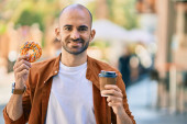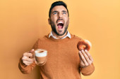 Zdjęcie "Młody Hiszpan pijący kawę i jedzący ciasto uśmiechnięty ze szczęśliwym i chłodnym uśmiechem na twarzy. wykazujące zęby. " może być wykorzystywane do celów osobistych i komercyjnych zgodnie z warunkami zakupionej licencji Royalty-free. Obraz jest dostępny do pobrania w jakości wysokiej rozdzielczości do 5760x3840.