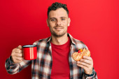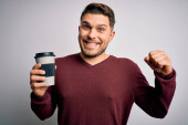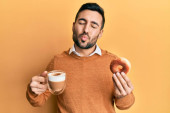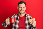 Młody Hiszpan pijący kawę i jedzący ciasto uśmiechnięty ze szczęśliwym i chłodnym uśmiechem na twarzy. wykazujące zęby.
