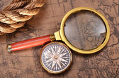 liny, Lupa, kompas i model klasyczny łodzi na stary papier