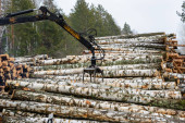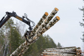 Żuraw ładuje drzewa. wycięte pnie drzew są ładowane do korpusu przenośnika. ładunki przemysłowe dla zakładów obróbki drewna