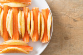 Marchewka kije w szkle na drewnianym stole. Wegetariańskie jedzenie dla wegetarian. Wzbogacona dieta niskokaloryczna wytwarzana z produktów rolnych