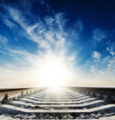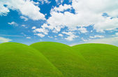 ścieżki ogrodowe kamienne z trawa rośnie między płaskim murze skały z blue sky i chmury nad horyzontem z lato.