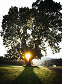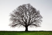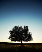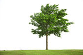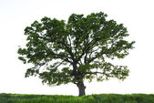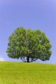 jedno drzewo na zielonej trawie pole i błękitne niebo lato powyżej.