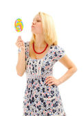 atrakcyjny blondynka zaskoczony z lizak gospodarstwa sukni, patrząc jak dziewczyna littile