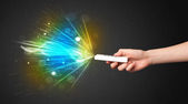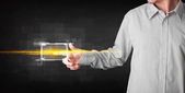 Młoda tech pani dotykając przycisk pomarańczowe wiązki światła koncepcja