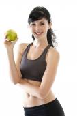 dziewczynka młody piękny fitness z zielonym jabłkiem na białym tle