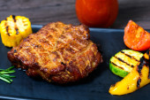 pieczone żeberka wieprzowe na drewnianym stole, widok z góry