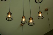 Lampy wiszące zdobią sufit. Wnętrze pokoju ozdobione jest światłami sufitowymi.