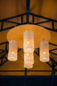 Zdjęcie "Lampy wiszące zdobią sufit. Wnętrze pokoju ozdobione jest światłami sufitowymi." może być wykorzystywane do celów osobistych i komercyjnych zgodnie z warunkami zakupionej licencji Royalty-free. Obraz jest dostępny do pobrania w jakości wysokiej rozdzielczości do 5760x3840.