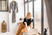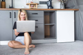 Happy casual piękna kobieta pracuje na laptopie siedzi w domu.