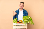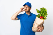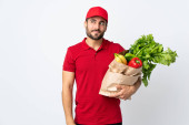 Dostawca z warzywami na białym tle ze smutnym wyrazem twarzy