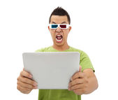 biznesmen trzymając tablet lub ipad i krzyczy do punktu