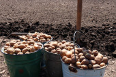 Dwa stare żelazne wiadro kiełkujących ziemniaków na ziemi. Ziemniaki kiełkowane do sadzenia na wiosnę w ogrodzie. Rolnictwo ekologiczne