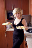 młoda kobieta oferuje posiłek, koszty kuchnia spełnia mąż