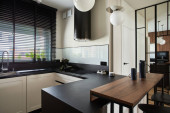 Zdjęcie "Panorama małego, otwartego mieszkania z salonem, kuchnią, jadalnią w jednym pomieszczeniu" może być wykorzystywane do celów osobistych i komercyjnych zgodnie z warunkami zakupionej licencji Royalty-free. Obraz jest dostępny do pobrania w jakości wysokiej rozdzielczości do 5760x3840.