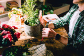 Zdjęcie "Zbliżenie człowieka trzymającego małą roślinkę Kenzia (Kentia) na rustykalnym drewnianym stole z różnymi akcesoriami, roślinami i sadzonkami, ogrodnictwo domowe, naturalne światło" może być wykorzystywane do celów osobistych i komercyjnych zgodnie z warunkami zakupionej licencji Royalty-free. Obraz jest dostępny do pobrania w jakości wysokiej rozdzielczości do 5760x3840.
