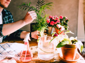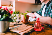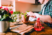 Zbliżenie człowieka trzymającego małą roślinkę Kenzia (Kentia) na rustykalnym drewnianym stole z różnymi akcesoriami, roślinami i sadzonkami, ogrodnictwo domowe, naturalne światło