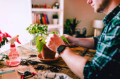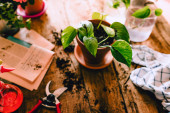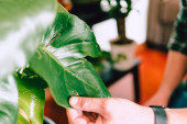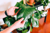 Zbliżenie człowieka podczas opieki nad chorymi roślinami Monstera Deliciosa, ogrodnictwo domowe, naturalne światło