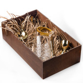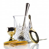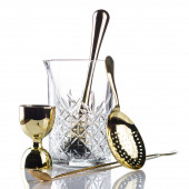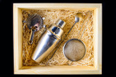 Barman sprzęt sito na białym w drewnianym pudełku, barman zestaw na białym tle. Zestaw narzędzi do przygotowywania koktajli izolowanych