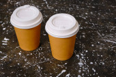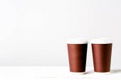 Dwie papierowe filiżanki herbaty lub kawy na wynos i torba na wynos na szarym tle. Koncepcja rozwoju biznesu restauracyjnego i dostaw żywności podczas kwarantanny covid 19.