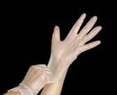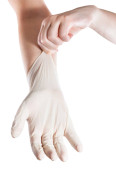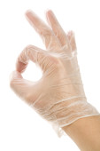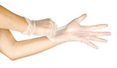 Ręce kobiet w rękawiczkach jednorazowego użytku izolowane na białym tle
