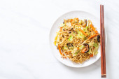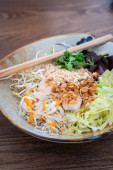 Flat-lay wegańskie sezamu soba makaron sałatka z dużą ilością warzyw z pałeczkami na białym tle marmuru, przepis bezglutenowy, zdrowe jedzenie, dieta wegańska