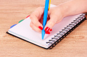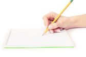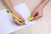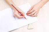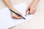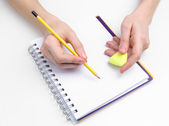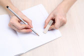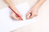 ludzkie ręce ołówek pisać na papier i Wymaż gumy na tle drewniany stół