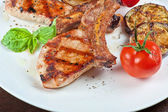 stek z grilla, grilla warzywa i smażone kawałki ziemniaków na desce na tle tabeli