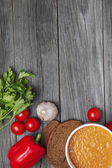 Stylowa brązowa gliniana miska z ukraińskim barszczem na czarnym stole, płaska leżanka. Miejsce na tekst