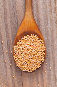 Musztarda przyprawa w łyżką na drewniane tła