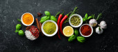 Zestaw kolorowych przypraw w miskach i ziołach na czarnym kamiennym tle. Widok z góry. Widok z góry.