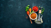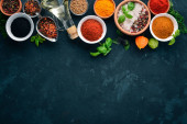 Zdjęcie "Zestaw indyjskich aromatycznych przypraw i ziół na czarnym kamiennym tle. Widok góry. Wolne miejsce na tekst." może być wykorzystywane do celów osobistych i komercyjnych zgodnie z warunkami zakupionej licencji Royalty-free. Obraz jest dostępny do pobrania w jakości wysokiej rozdzielczości do 5760x3840.