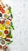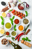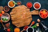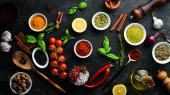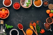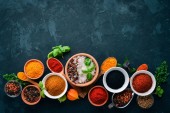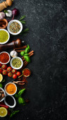 Zestaw indyjskich aromatycznych przypraw i ziół na czarnym kamiennym tle. Widok góry. Wolne miejsce na tekst.