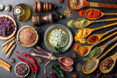 Zdjęcie "Zestaw indyjskich aromatycznych przypraw i ziół na czarnym kamiennym tle. Widok góry. Wolne miejsce na tekst." może być wykorzystywane do celów osobistych i komercyjnych zgodnie z warunkami zakupionej licencji Royalty-free. Obraz jest dostępny do pobrania w jakości wysokiej rozdzielczości do 5760x3840.