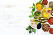 Zestaw indyjskich przypraw, bazylii i ziół na białym drewnianym tle. Widok góry. Wolne miejsce na tekst.