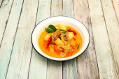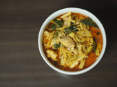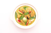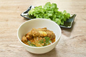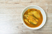 pikantne gotowane pęd bambusa z plasterkami suma w mleku kokosowym i curry na misce
