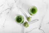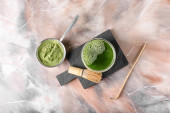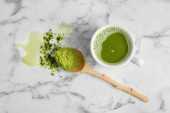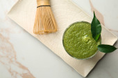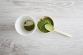 Filiżanka herbaty matcha, mleka, proszku i chasen na jasnym tle
