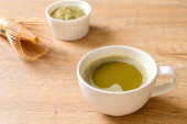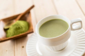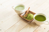Kompozycja z filiżanką herbaty matcha na kolorowe drewniane tło