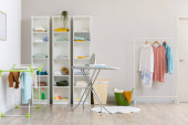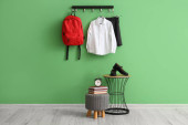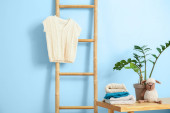 Nowoczesna skrzynia szuflad i roślin w pobliżu ściany kolor w pokoju