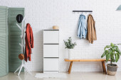Zdjęcie "Nowoczesna skrzynia szuflad i roślin w pobliżu ściany kolor w pokoju" może być wykorzystywane do celów osobistych i komercyjnych zgodnie z warunkami zakupionej licencji Royalty-free. Obraz jest dostępny do pobrania w jakości wysokiej rozdzielczości do 5760x3840.