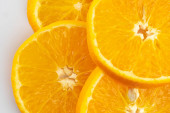 Smaczne plasterki pomarańczy na białym tle, zbliżenie