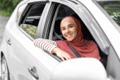 szczęśliwy Emiraty Arabia kobieta jazdy samochodem z kciukiem